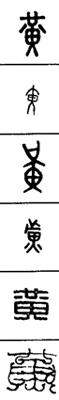 huáng 《广韵》:中央色也。亦官名,有乘黄令。……又州名……亦姓。 胡光切 宕合一平唐匣