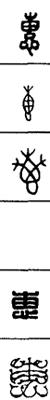 从上到下依次是小篆、甲骨文、金文、古玺及战国文字、缪篆及汉代文字、鸟虫篆。