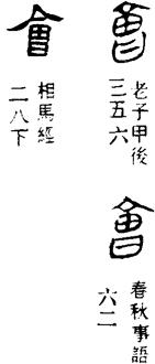會姒鬲:“會始(姒)乍朕(媵)鬲。”會為國名,後孳乳作鄶。《説文》:“鄶,祝融之後,妘姓所封。澮、洧之間。鄭滅之。”在今河南密縣東南。字亦作檜,《詩·國風》有《檜風》。按鄶國之鄶,《史記·楚世家》、《漢書·地理志》作會,《大戴禮·帝繫》、《國語·鄭語》等作鄶。