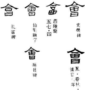 甲骨文、金文的会字,下面的口代表容器,上面是器盖,中间是装在容器中的东西,表示器、盖相合的意思。所以会字的本义为汇合、聚合,引申为相逢、见面,同时又指有目的的集会或某些团体,如晚会、报告会、工会等。此外,会字还有理解、懂得、通晓、擅长等义,如体会、能说会道等。