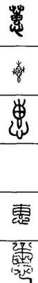 从上到下依次是小篆、甲骨文、金文、古玺及战国文字、缪篆及汉代文字、鸟虫篆。