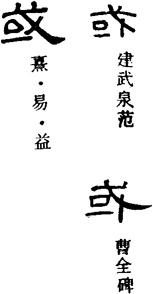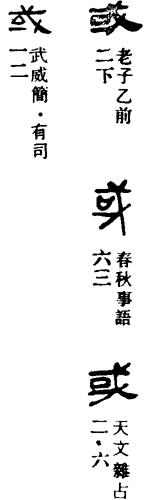 貯。”齊鎛:“勿或逾改。”哀成叔鼎:“勿或能(治)。”石鼓文《靈雨》:“或陰或陽。”長沙子彈庫戰國楚帛書甲:“毋弗或敬。”又馬王堆帛書《六十四卦·比》初六:“有復(孚)盈缶,冬(終)來或池(它)。”又帛書《六十四卦·隋(隨)》初九:“官或諭(渝)貞,吉。”又帛書《六十四卦·謙》上六:“冥豫成或諭(渝),无咎。”諸或字今通行本《易》皆作有。郭店楚簡本《老子》簡一~二:“三言以為