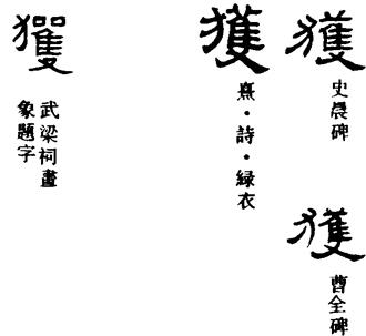 获字的本义是指打猎时捕获的禽兽,用作动词,则泛指出猎而有所得,引申为俘获,收获、得到等义。甲骨文、金文的获字,从又从隹,象捕鸟在手之形,与训“鸟一枚”的“隻”(只的繁体)字同形,属会意字。篆书获字则变成为从犬蒦声的形声字。