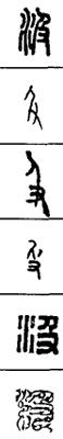 从上到下依次是小篆、甲骨文、金文、古玺及战国文字、缪篆及汉代文字、鸟虫篆。
