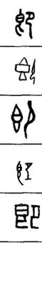 从上到下依次是小篆、甲骨文、金文、古玺及战国文字、缪篆及汉代文字、鸟虫篆。