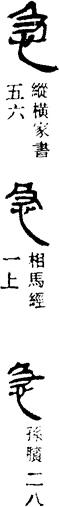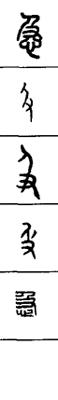 从上到下依次是小篆、甲骨文、金文、古玺及战国文字、缪篆及汉代文字、鸟虫篆。