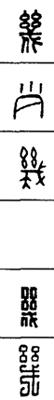 从上到下依次是小篆、甲骨文、金文、古玺及战国文字、缪篆及汉代文字、鸟虫篆。