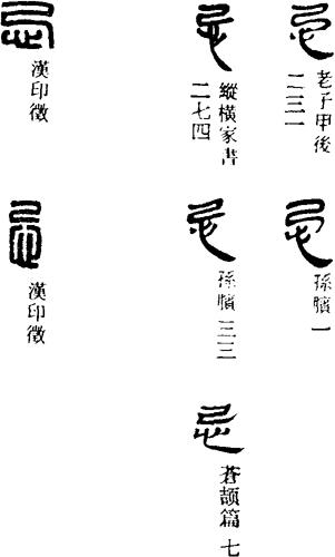 从上到下依次是小篆、甲骨文、金文、古玺及战国文字、缪篆及汉代文字、鸟虫篆。