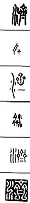 从上到下依次是小篆、甲骨文、金文、古玺及战国文字、缪篆及汉代文字、鸟虫篆。