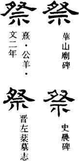 〈辨〉祭字甲骨文象手持牲肉、有血滴下落的样子,有时更从示作手持牲肉祭献神主之前的形态,本义即为以祭品献神。金文、篆书字形讹变,楷书作祭。