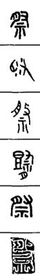 从上到下依次是小篆、甲骨文、金文、古玺及战国文字、缪篆及汉代文字、鸟虫篆。