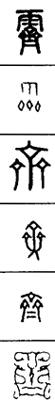 从上到下依次是小篆、甲骨文、金文、古玺及战国文字、缪篆及汉代文字、鸟虫篆。