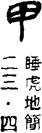 zhāo:通“朝”,早晨。)引申为第一。《论衡·超奇》:“彼子长、子云说论之徒,君山为甲。”(子长:司马迁的字。子云:扬雄的字。君山:桓谭的字。)《史记·魏其武安侯列传》:“治宅甲诸第。”(甲:用如动词,居第一位。第:官宦的大住宅。)⑤科举制度中殿试录取的等第。《宋史·选举志一》:“进士始分三甲。”⑥代指失传或虚构的人名。《左传·昭公二十五年》:“季公鸟娶妻于齐鲍文子,生甲。”(季公鸟、鲍文子:人名。)杜牧《与友人论谏书》:“甲谓乙曰。”⑦通“押”。亲近,亲昵。《诗经·卫风·芄兰》:“虽则佩