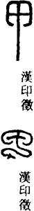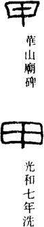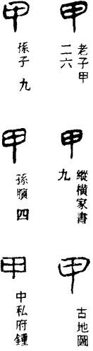 〈辨〉甲字甲金文初作十,象种子萌发皮甲开裂之形。因为甲金文中甲字与数字十同形,所以后来借■为甲;■非田字,中间十字和边框不交,本是报甲的合文,象示名甲的神主牌位盛于石函之形。而