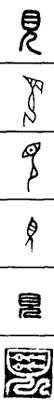 从上到下依次是小篆、甲骨文、金文、古玺及战国文字、缪篆及汉代文字、鸟虫篆。
