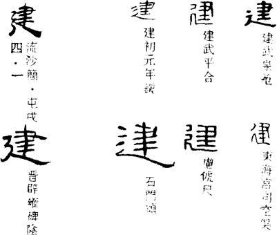 ①建立,设置。《周礼·天官·冢宰》:“惟王建国。”《左传·襄公三年》:“建一官而三物成。”(官:官职。物:事。)又为树立,竖立。《周礼·春官·巾车》:“建大麾以田,以封蕃国。”(麾huī:指挥用的旗子。田:打猎。蕃国:指诸侯国。)②建议。《汉书·霍光传》:“何不建白太后,更选贤而立之?”(白:说明。)司马光《乞罢条例司常平使疏》:“建画之臣,不能仰副圣意。”(画:谋划。副:合。)③建造,建筑。张衡《东京赋》:“楚筑章华于前,赵建丛台于后。”(章华、丛台:高台名。)④倾倒。《史记·高祖本纪》:“譬犹居高屋之上建瓴水也。”(瓴líng:盛水瓶。)⑤北斗柄所指为建。斗柄所指十二辰称十二月建。《淮南子·天文》:“正月建寅。”⑥星座名。《吕氏春秋·仲春》:“旦建星中。”(中:指位于南方中天。)
