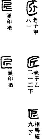 从上到下依次是小篆、甲骨文、金文、古玺及战国文字、缪篆及汉代文字、鸟虫篆。