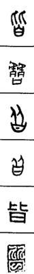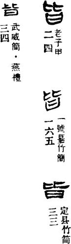〈辨〉皆字金文上从二人,下从甘,二人同甘表示二人同食一物则感觉相同,义为俱。篆书讹变,从比从白,白即自字,自为鼻,亦表示二人声气相同之意。楷书作皆。