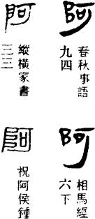 (一)ā[缀]①用在小名、排行的前面,有亲昵意。《资治通鉴·孙权劝学》:卿今者才略,非复吴下阿蒙!袁枚《祭妹文》:阿品远官河南,亦无子女,九族无可继者。②用在某些称谓前面。《孔雀东南飞(并序)》:我自不驱卿,逼迫有阿母。白居易《琵琶行(并序)》:弟走从军阿姨死,暮去朝来颜色故。袁枚《祭妹文》:其下两冢,一为阿爷侍者朱乐,一为阿兄侍者陶氏。