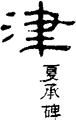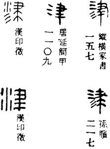 ①渡口。《论语·微子》:“孔子过之,使子路问津焉。”王勃《滕王阁序》:“舸舰迷津。”引申为途径,门径。《晋书·陶侃传》:“逵曰:‘卿欲仕郡乎?’侃曰:‘欲之,困于无津耳。’”又引申为职位,地位。《抱朴子·审举》:“于时悬爵而卖之,犹列肆也。争津者买之,犹市人也。”〔津要〕水陆要隘。《宋书·武帝纪上》:“时议者谓宜分兵守诸津津。”比喻事物的关键。江淹《无为论》:“宣尼六艺之文,百氏兼该之术,靡不详其津津。”(兼该:兼备。)又比喻重要职位或身居要职之人。《晋书·庾亮传论》:“是以厚赠琼瑰,罕升津津。”《南齐书·竟陵文宣王子良传》:“交关津津,共相唇齿。”又比喻重要的途径。《续资治通鉴·宋仁宗皇祐元年》:“(三馆职事)遂为贵游进取之津津。”(贵游:无官职的王公贵族。)②渡。潘岳《西征赋》:“津便门以右转,究吾境之所暨。”(暨jì:至。)引申为传授。《新论·崇学》:“道象之妙,非言不津。”③生物的体液。《素问·调经论》:“人有精气津液。”元稹《和乐天赠吴丹》:“委气荣卫和,咽津颜色好。”(荣卫:指气血。)又指水。沈约《新安江水至清浅深见底贻京邑游好》:“沧浪有时浊,清济涸无津。”④润泽,滋润。《周礼·地官·大司徒》:“其民黑而津。”《西京杂记》卷五:“雨不破块,润叶津茎而已。”(破块:毁坏农田。)⑤[津津]1.洋溢的样子。周亮工《庚子嘉平五日雪初闻欲徙塞外》:“遥看松栝叶,生意已津津。”2.兴味浓厚的样子。《白雨斋词话》卷四:“而世顾津津称之。”今成语有“津津有味”、“津津乐道”。3.喜悦的样子。《新唐书·李林甫传》:“喜津津出眉宇间。”⑥古地名。春秋时楚地。故址在今湖北枝江县境内。《左传·庄公十九年》:“楚子御之,大败于津。”