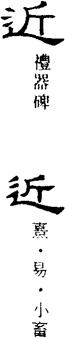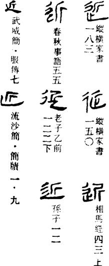 ㈠ jìn ①近,与“远”相对。《孟子·公孙丑上》:“齐、滕之路不为近矣。”陶潜《桃花源记》:“缘溪行,忘路之远近。”(缘,沿着。)此指距离短。《论语·卫灵公》:“人无远虑,必有近忧。”贺知章《回乡偶书》之二:“近来人事半消磨。”此指时间不长久。②靠近,接近。《论语·季氏》:“今夫颛臾,固而近于费。”(颛臾:鲁国的属国。费bì:地名。)柳宗元《三戒·黔之驴》:“稍出近之。”(稍:渐渐。)此指位置接近。《后汉书·方术传下·蓟子训》:“已近五百岁矣。”(岁:年。)此指时间接近。《礼记·中庸》:“好学近乎知。”(知:智。)《孟子·滕文公上》:“饱食、暖衣、逸居而无教,则近于禽兽。”此指情况相近似。③亲近。《左传·襄公二十五年》:“公鞭侍人贾举,而又近之。”(鞭:用如动词,鞭打。)又为亲近的人。《韩非子·难言》:“昵近习亲。”(昵、习:亲近。)④浅近,浅显。《孟子·尽心下》:“言近而指远者,善言也。”(指:意思。)