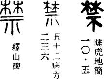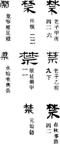 ㈠ jìn ①禁止,制止。《墨子·节葬下》:“此譬犹禁耕而求获也。”《庄子·胠箧》:“斧钺之威弗能禁。”(钺:大斧。)引申为禁令。《荀子·君子》:“皆知夫犯上之禁不可以为安也。”《吕氏春秋·适威》:“令苛则不听,禁多则不行。”②忌讳。《汉书·艺文志》:“及拘者为之,则牵于禁忌。”(拘者:固执不通的人。牵:牵制。)《论衡·讥日》:“举事若病死灾患,大则谓之犯触岁月,小则谓之不避日禁。”③不能随便进入的地方。《周礼·天官·阍人》:“掌守王宫之中门之禁。”《韩非子·内储说上》:“不救火者比降北之罪,逐兽者比入禁之罪。”(比:比照。北:败逃。)特指帝王居住的地方。《史记·秦始皇本纪》:“二世常居禁中。”(二世:秦二世胡亥。)④监禁,拘禁。《魏书·安定王休传》:“乃免官,禁之别馆。”又为拘禁人的地方,监狱。《金史·世宗纪下》:“命罪人在禁有疾,听亲属入视。”⑤施禁咒术。《后汉书·方术传下·徐登》:“登乃禁溪水,水为不流。”⑥祭祀时承放酒尊的器具。《礼记·玉藻》:“士侧尊用禁。”