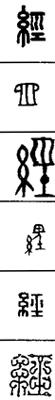金文的经字本是个象形字,象绷撑在织布机上的三根“经线”之形;后来增加丝旁(糸),于是经字变成左形右声的形声字。经的本义是指织物的纵线,与“纬”相对。南北为经、东西为纬。经纬是道路主干的方向,引申指大道,又引申指常行的道理、规则、法制、原则等。此外,经字还可用作动词,有经历、量度、治理等义。