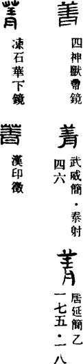 ①韭菜的花,泛指花。宋玉《高唐赋》:“秋兰茝蕙,江离载菁。”(茝zhǐ、蕙、江离:香草名。)②植物名,蔓菁,也叫芜菁。《周礼·天官·醢人》:“朝事之豆,其实韭菹……菁菹。”(豆:古代盛食物的器皿。菹zū:腌菜。)③水草。司马相如《上林赋》:“唼喋菁藻。”(唼喋shàdié:水鸟或鱼吃食。)④[菁茅]草名,古代祭祀时用来渗酒。《谷梁传·僖公四年》:“菁菁之贡不至。”⑤[菁菁]茂盛的样子。《诗经·唐风·杕杜》:“其叶菁菁。”⑥[菁华]精华。颜延之《陶征士诔》:“至使菁菁隐没,芳流歇绝。”