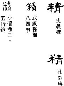 ①纯净的好米。《庄子·人间世》:“鼓策播精,可以食十人。”(策cè:小簸箕。)②精华,精粹。《吕氏春秋·察传》:“夫乐,天地之精也。”《抱朴子·嘉遁》:“茹八石之精英。”又指精良,精锐。《吕氏春秋·简选》:“选练角材,欲其精也。”《史记·匈奴列传》:“冒顿匿其精兵,见其羸弱。”③明亮,清朗。《淮南子·览冥》:“于是日月精明,星辰不失其行。”《史记·天官书》:“天精而见景星。”④精诚,专一。《吕氏春秋·博志》:“用志如此其精也。”《淮南子·修务》:“官御不厉,心意不精。”⑤精气,古代认为构成万物的最原始的物质。《吕氏春秋·圜道》:“精行四时,一上一下,各与遇,圜道也。”又特指精神,《论衡·论死》:“人死精亡而形存。”⑥两性赖以繁殖后代的物质。《周易·系辞下》:“男女构精,万物化生。”⑦精灵,鬼怪。《淮南子·氾论》“山出