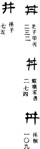 jǐng 《广韵》:说文曰,八家一井,象构韩形,·,瓮之象也,古者伯益初作井。今作井。 子郢切 梗开三上静精