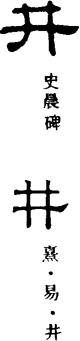 甲骨文井字,象井口用木石构成的井栏,其本义就是水井。而形似水井的事物皆可称井,如天井、矿井等。古代制度,同一乡里以八家共井,后来井引申指乡里、人口聚居地,如市井、井里等。井字还含有整齐、有条理之义,如“井井有条”、“秩序井然”等。