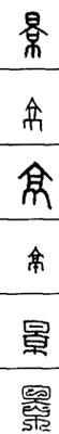 从上到下依次是小篆、甲骨文、金文、古玺及战国文字、缪篆及汉代文字、鸟虫篆。