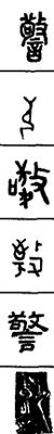 从上到下依次是小篆、甲骨文、金文、古玺及战国文字、缪篆及汉代文字、鸟虫篆。