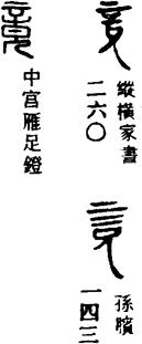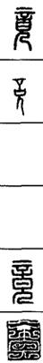 从上到下依次是小篆、甲骨文、金文、古玺及战国文字、缪篆及汉代文字、鸟虫篆。