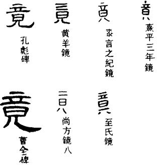 漢鏡銘鏡字多作竟,如“王氏作竟四夷服”、“青羊作竟大毋傷”、“吾作明竟,幽湅三商”、“李氏作竟佳且好”、“尚方乍竟真大巧”。亦作鏡,如“騶氏作鏡四夷服,多賀國家人民息”。