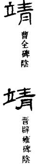㈠jìng ①安定。《国语·周语下》:“自后稷之始基靖民。”②平定。《左传·僖公九年》:“君务靖乱。”③恭敬。《管子·大匡》:“士处靖,敬老与贵,交不失礼。”④图谋。《诗·大雅·召旻》:“实靖夷我邦。”⑤细小貌。靖人,亦作“竫人”、“诤人”。古代传说中的小人。⑥通“静”。⑦姓。唐代有靖君亮。