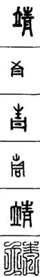 从上到下依次是小篆、甲骨文、金文、古玺及战国文字、缪篆及汉代文字、鸟虫篆。