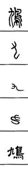 从上到下依次是小篆、甲骨文、金文、古玺及战国文字、缪篆及汉代文字、鸟虫篆。