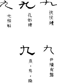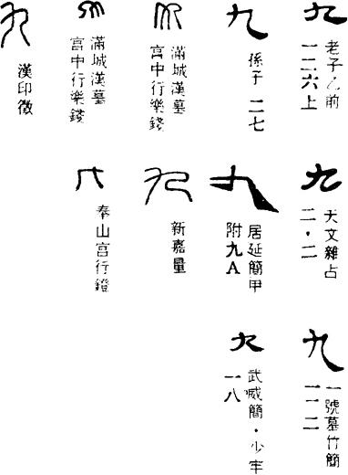 古文字的九字象人手臂弯节之形,指手肘,当即“肘”的本字。借用为数目字,除专指“9”这个特定的数目外,也虚指多数。