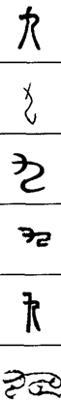 从上到下依次是小篆、甲骨文、金文、古玺及战国文字、缪篆及汉代文字、鸟虫篆。