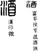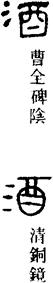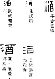 【说明】“酒”为会意兼形声字,表示酒从酒器(酉)中酌出。“酉”也是音符。