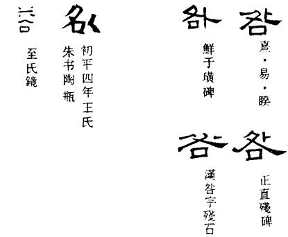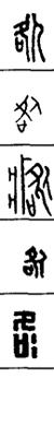 从上到下依次是小篆、甲骨文、金文、古玺及战国文字、缪篆及汉代文字、鸟虫篆。