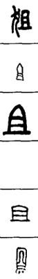 从上到下依次是小篆、甲骨文、金文、古玺及战国文字、缪篆及汉代文字、鸟虫篆。