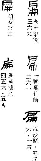 ㈢biàn 〔通〕通“遍”。《荀子·修身》:“扁善之度。”王先谦集解引王念孙曰:“扁读为遍。扁善者,无所往而不善也。”