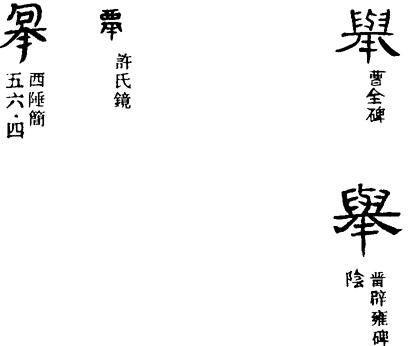 jǔ “舉”篆书楷化异形。《广韵》:舉,……说文本作“擧”。