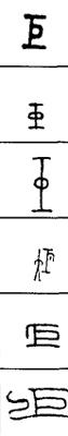从上到下依次是小篆、甲骨文、金文、古玺及战国文字、缪篆及汉代文字、鸟虫篆。