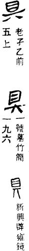 【说明】“具”为会意字,双手持鼎(古代煮肉的器具),表示准备饭食或酒席的意思。参附录三。