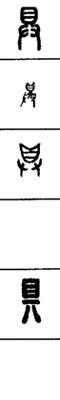 从上到下依次是小篆、甲骨文、金文、古玺及战国文字、缪篆及汉代文字、鸟虫篆。