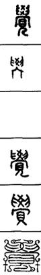从上到下依次是小篆、甲骨文、金文、古玺及战国文字、缪篆及汉代文字、鸟虫篆。