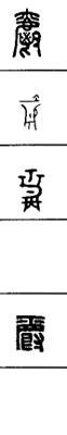 从上到下依次是小篆、甲骨文、金文、古玺及战国文字、缪篆及汉代文字、鸟虫篆。